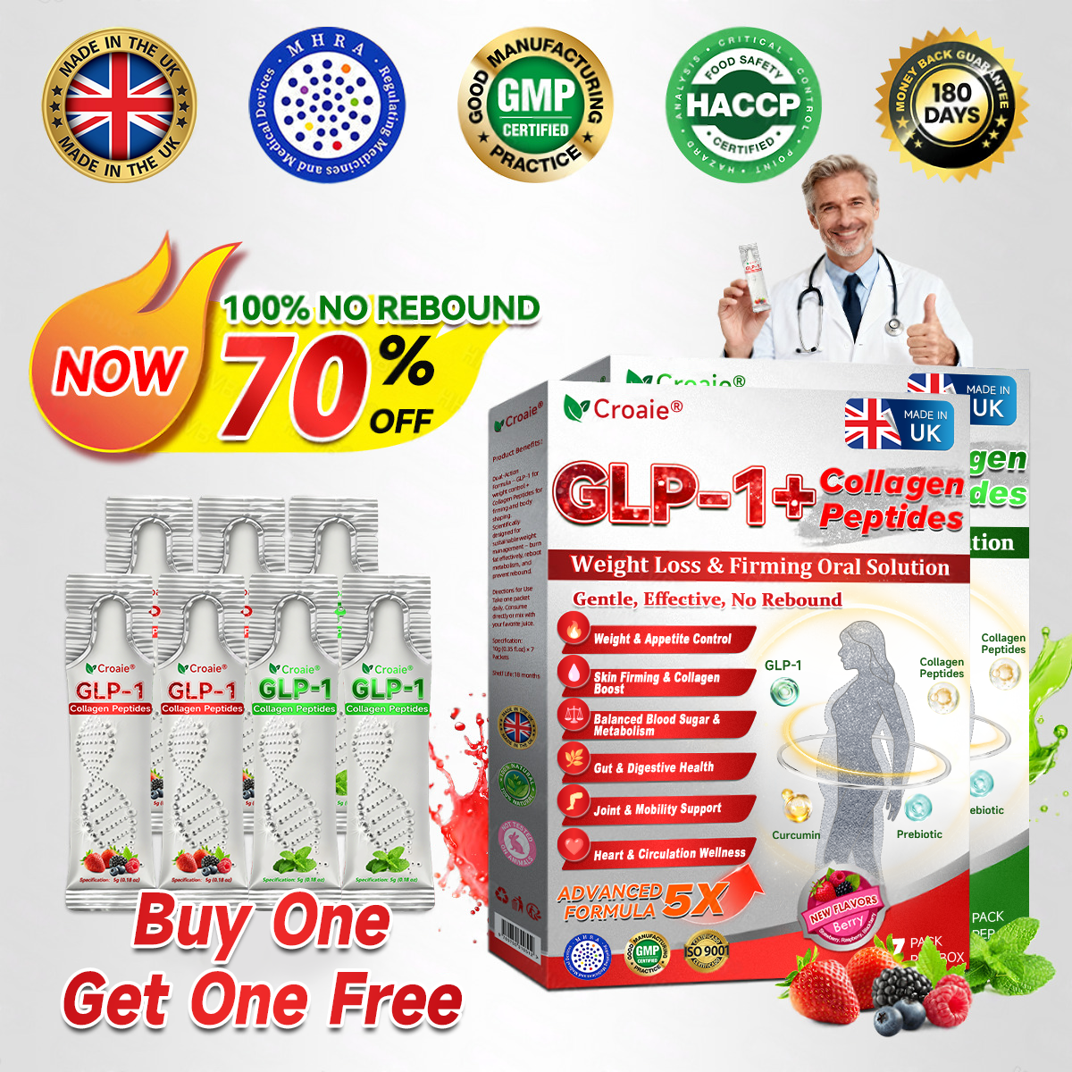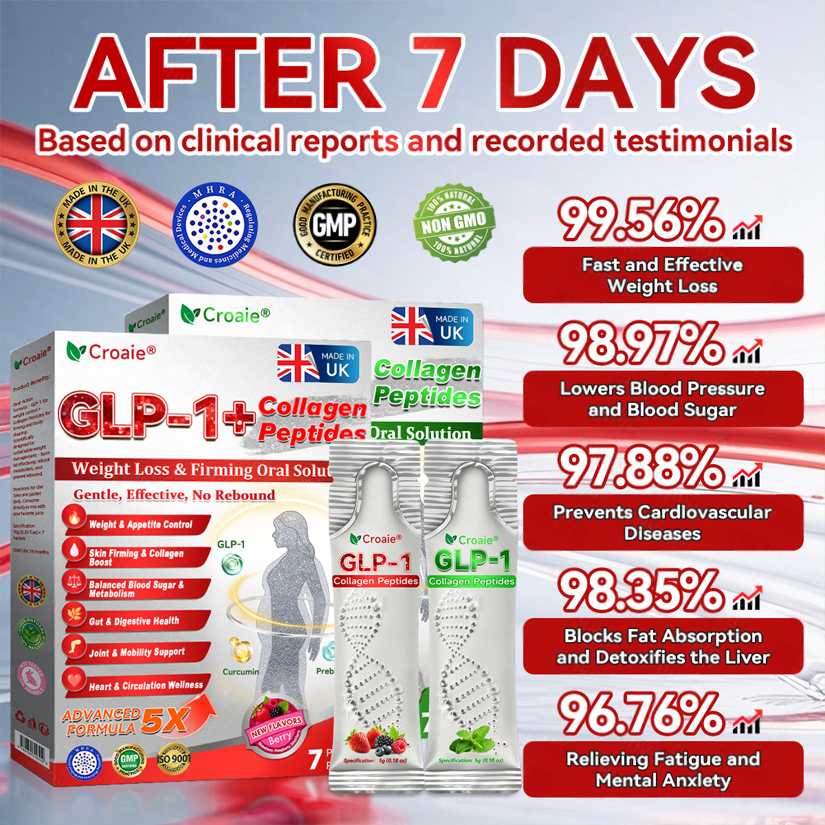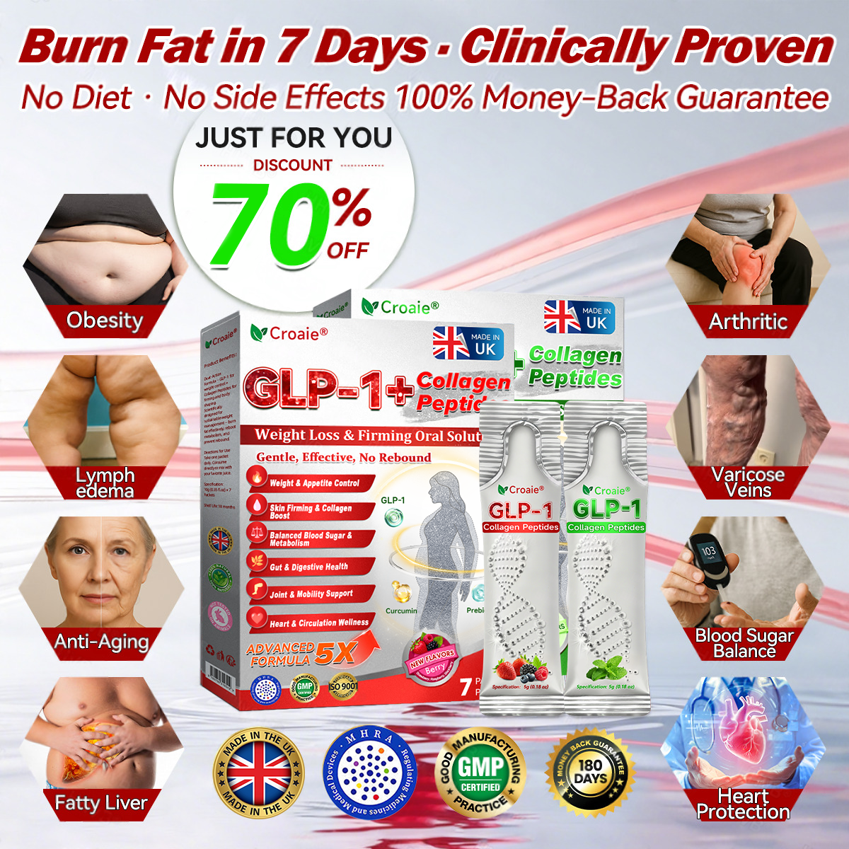 Clinically validated by endocrinologists, CroaieÂŽGLP-1 + Collagen Peptides Oral Solution delivers visible improvements in obesity, skin firmness, and overall health within just 7 days.